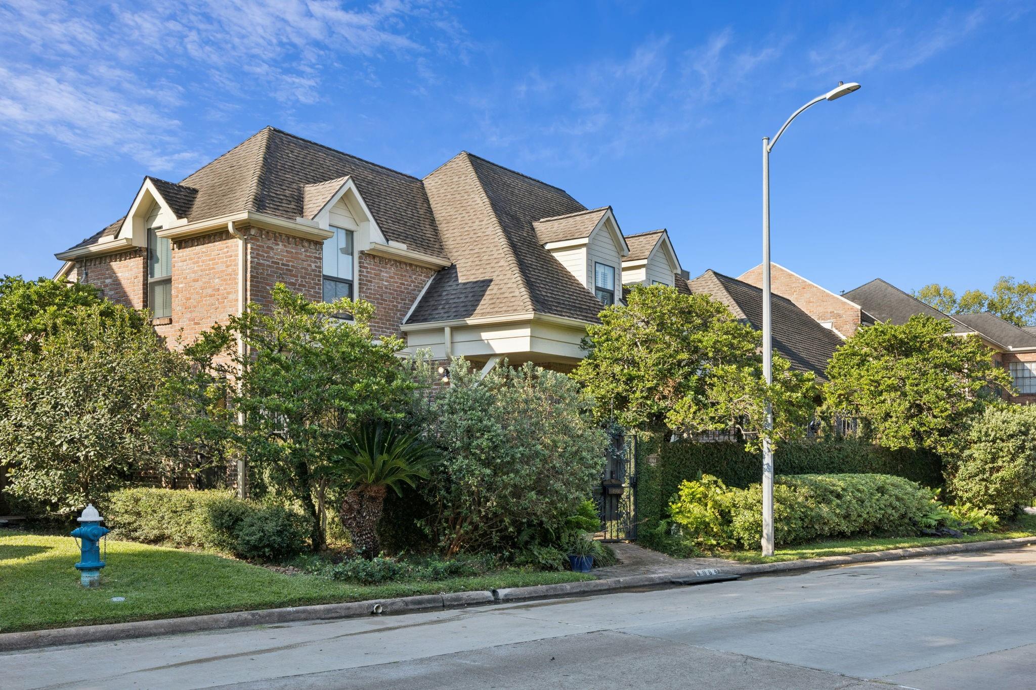 This distinctive end-unit townhouse, originally a freestanding residence, was later joined at the garage to its neighbor, preserving the feel of a stand-alone home. Designed by renowned architect Lucian Hood, it boasts soaring ceilings, abundant natural light from three sides, and expansive windows framing serene views of a landscaped green space. A private front courtyard and a dramatic sunlit atrium create inviting indoor-outdoor living. The home offers two spacious primary suites-one upstairs and one downstairs-each with large baths and generous closets. Extensive high-end upgrades enhance its elegance and comfort including two A/C units replaced 2024, 2025 kitchen appliances, and quartz countertops in upstairs Primary replaced 2025. Custom glass doors in office and living room added 2025. Nestled on a quiet, oak-lined street in the sought-after Tanglewood area, residents enjoy a low-maintenance lifestyle with HOA-provided grounds care, security patrol, and access to the area pool.