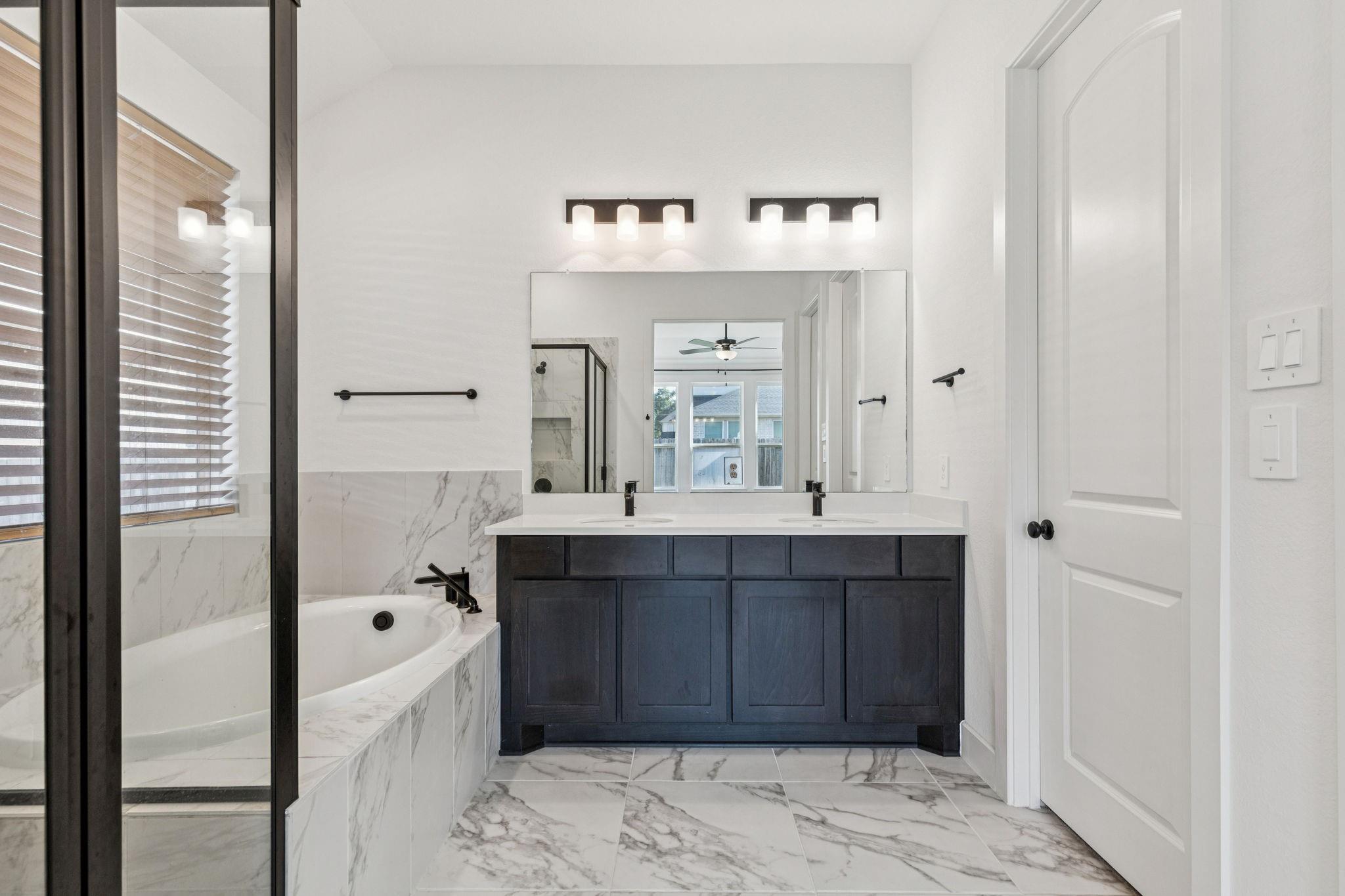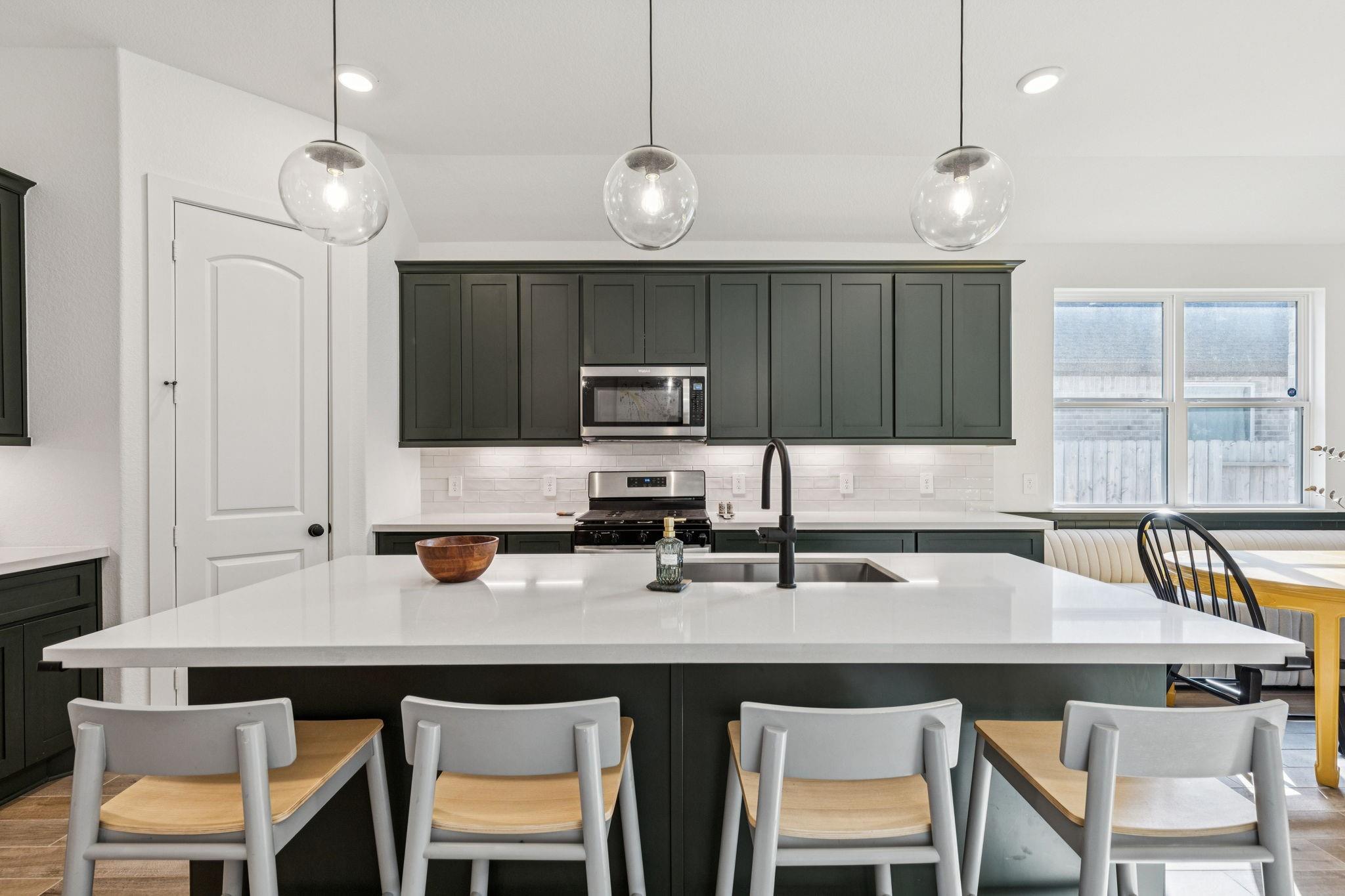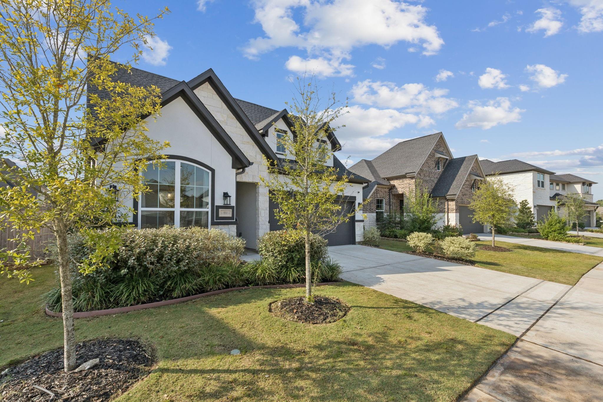 Beautiful like-new one-story Toll Brothers home in the desirable Lakes at Creekside community. Thoughtfully designed with stylish upgrades, this home features dark green kitchen cabinetry with white quartz countertops, stainless steel appliances, and elegant pendant lighting. Wood-look tile flows through the main living areas and Primary bedroom, while modern bathrooms showcase marble and herringbone tile details. Bright white walls and tasteful window coverings create a clean, inviting atmosphere. The split floor plan offers privacy with one bedroom and bath at the front, two additional bedrooms and a hall bath in the center, and the Primary suite tucked privately at the rear. Expansive glass stacking doors open from the Living Room to a large covered patio, perfect for entertaining or relaxing. All bedrooms include walk-in closets, combining comfort, style, and functionality in a truly move-in-ready home. Enjoy the plentiful amenities Lakes at Creekside has to offer and fall in love!