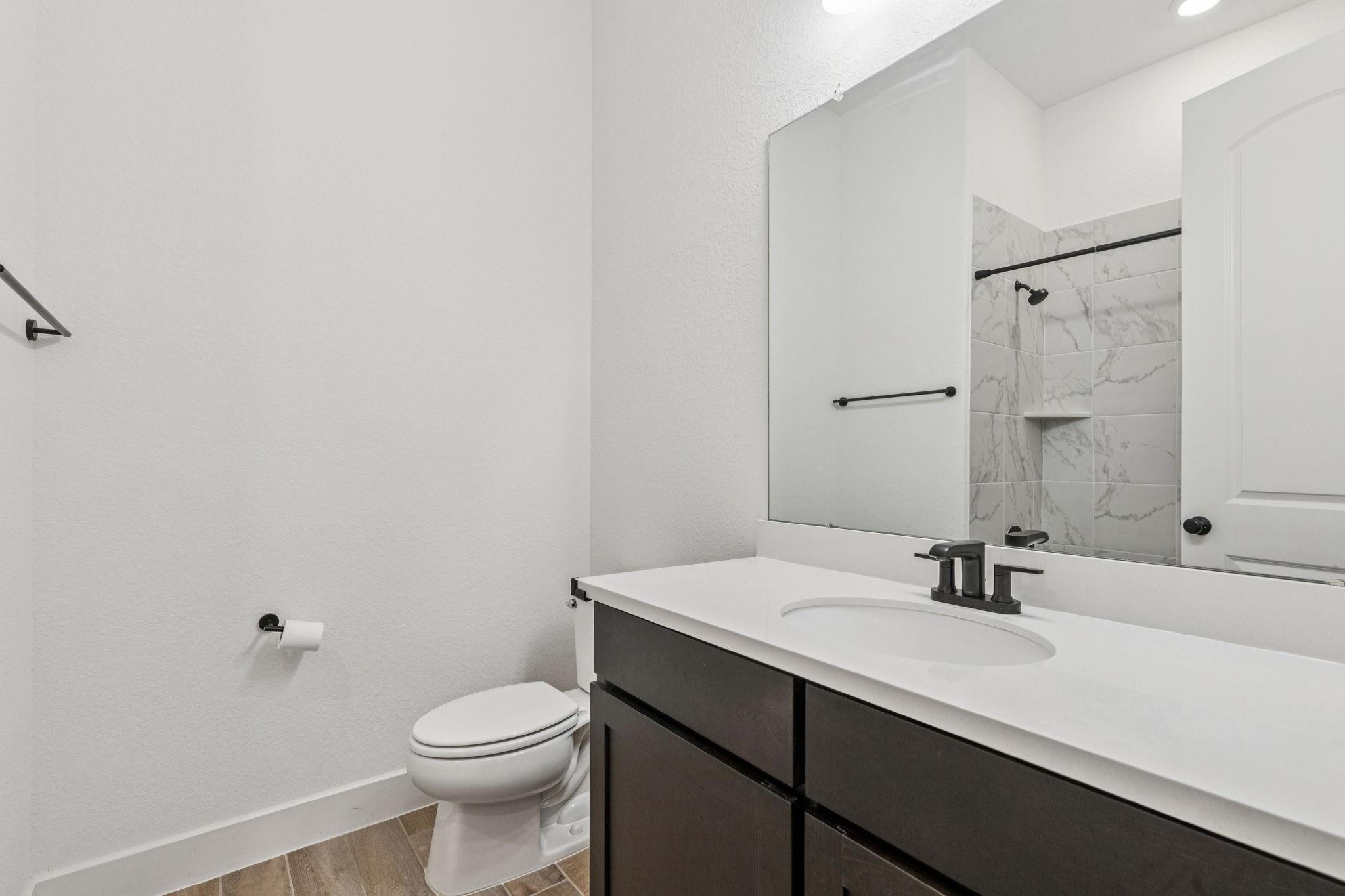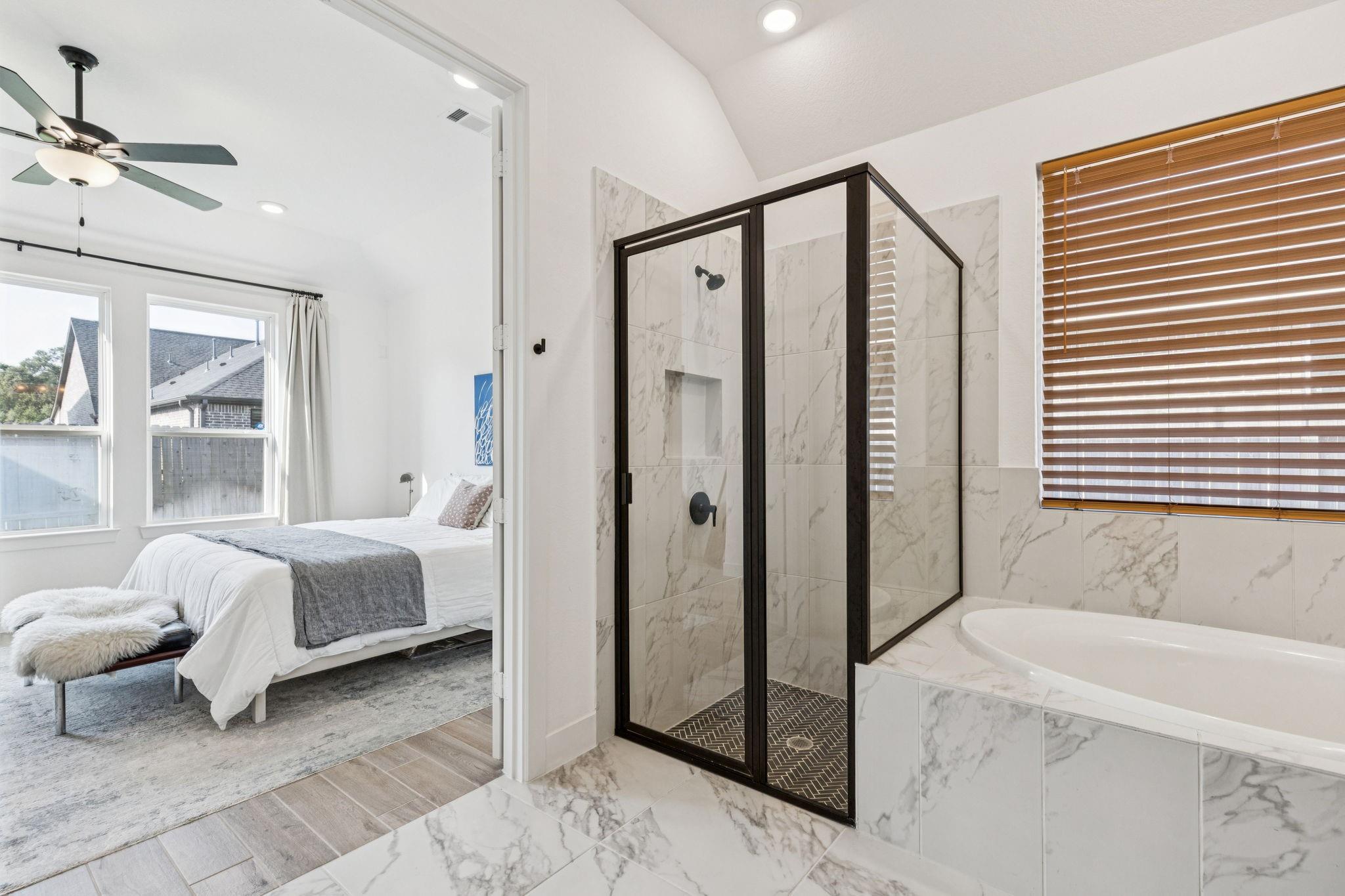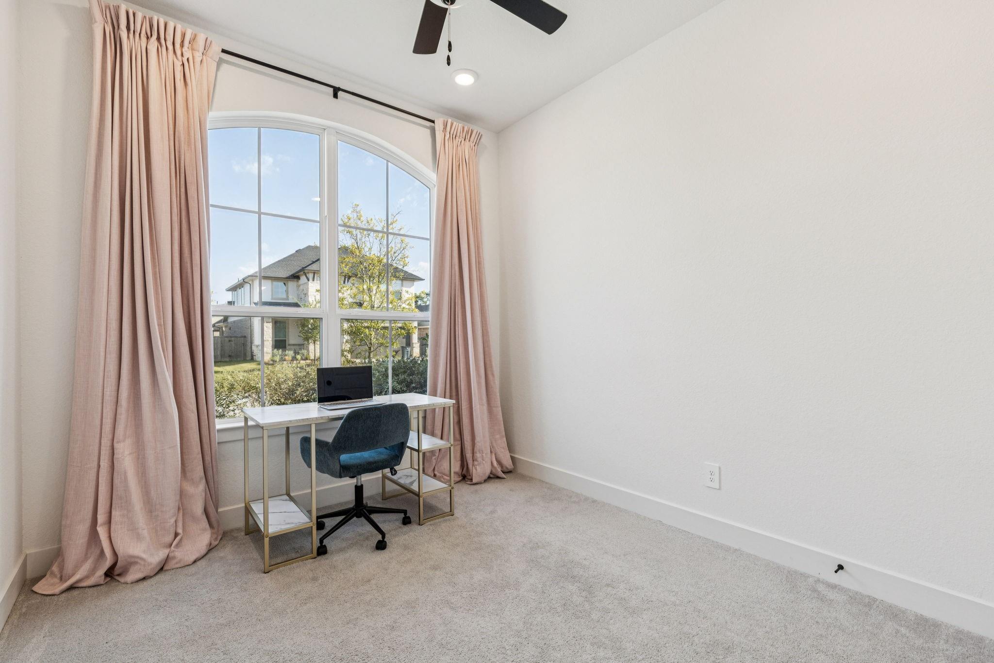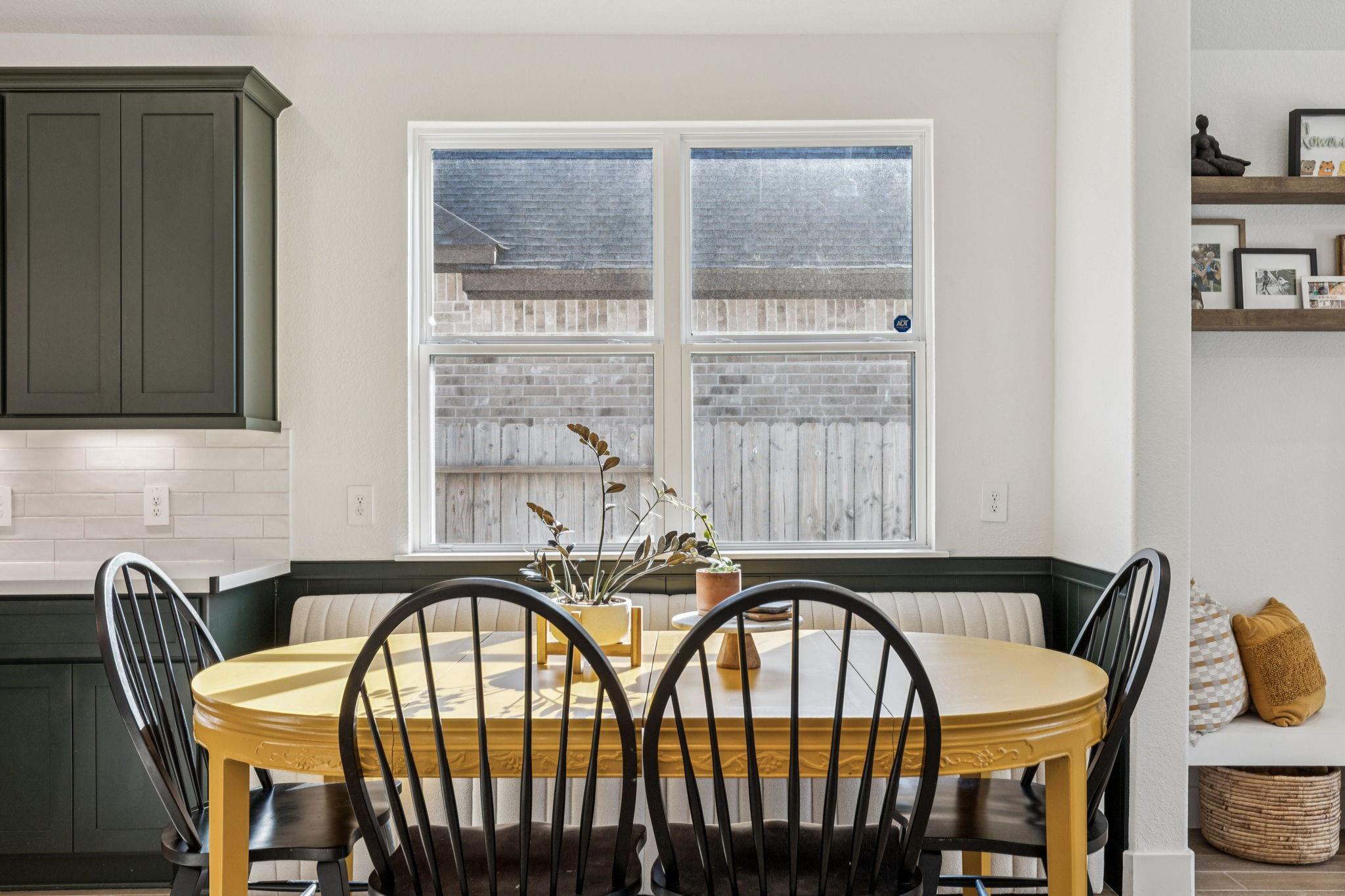 Beautiful like-new one-story Toll Brothers home in the desirable Lakes at Creekside community. Thoughtfully designed with stylish upgrades, this home features dark green kitchen cabinetry with white quartz countertops, stainless steel appliances, and elegant pendant lighting. Wood-look tile flows through the main living areas and Primary bedroom, while modern bathrooms showcase marble and herringbone tile details. Bright white walls and tasteful window coverings create a clean, inviting atmosphere. The split floor plan offers privacy with one bedroom and bath at the front, two additional bedrooms and a hall bath in the center, and the Primary suite tucked privately at the rear. Expansive glass stacking doors open from the Living Room to a large covered patio, perfect for entertaining or relaxing. All bedrooms include walk-in closets, combining comfort, style, and functionality in a truly move-in-ready home. Enjoy the plentiful amenities Lakes at Creekside has to offer and fall in love!
